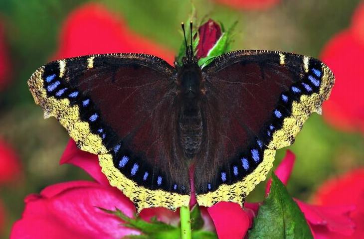 Esta mariposa capa de luto (también conocida como belleza de Camberwell) es una mariposa con contornos inusuales de las alas delanteras. Las alas marrón oscuro tienen bordes pálidos, moteados y un margen interno oscuro con manchas azules. Los huevos se ponen en racimos grandes en olmo, álamo y sauces. La oruga es negra con manchas blancas y tiene manchas marrones en la parte posterior. Esta larva come las hojas de álamo, olmo, salix y betula. Los adultos beben sorbos de zumos de frutas, savia de roble y néctar de flores