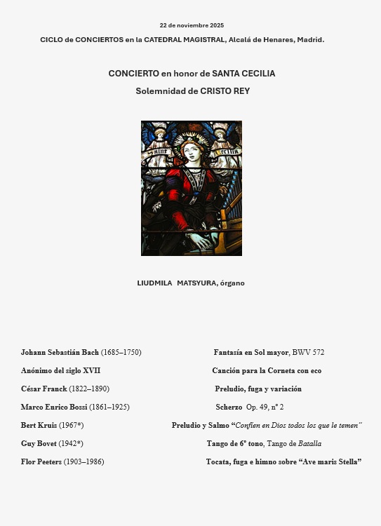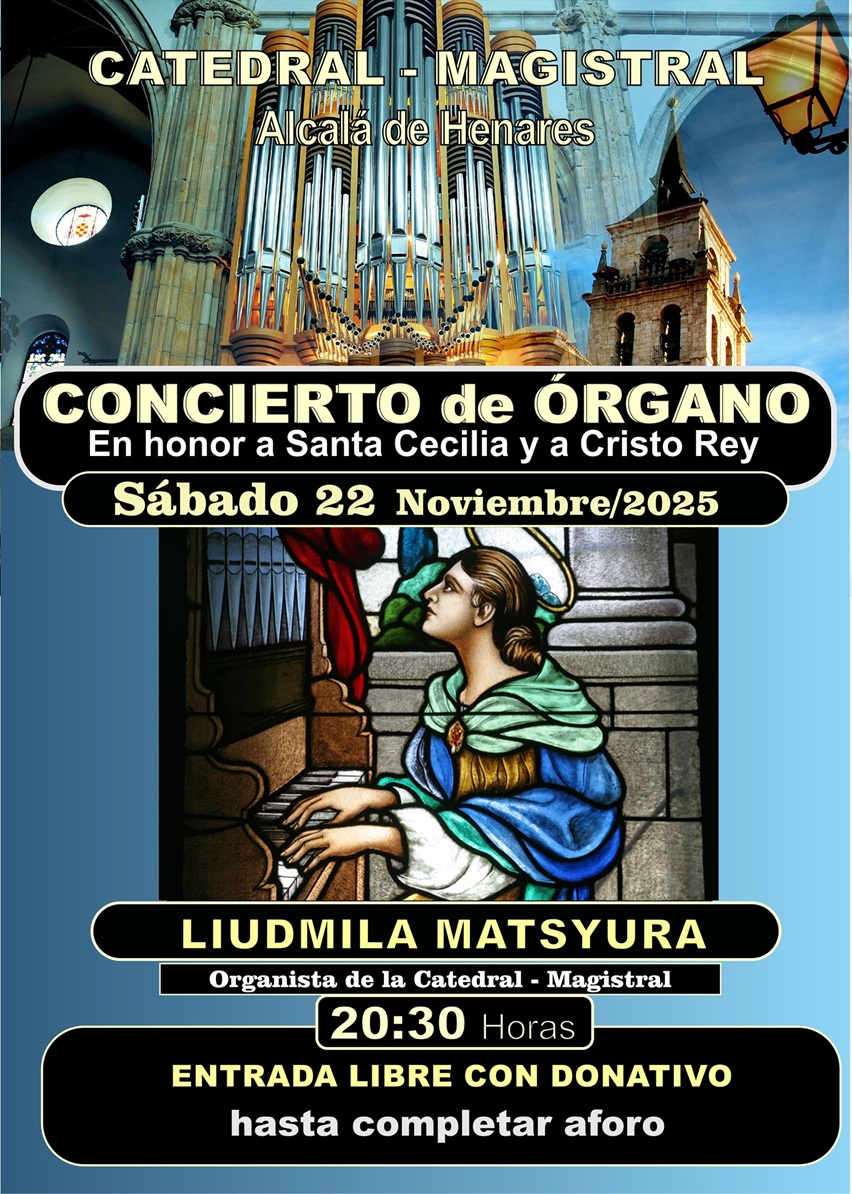 Música de órgano en Alcalá | 17/noviembre/2025.– La Santa e Insigne Catedral-Magistral de Alcalá de Henares acogerá un gran concierto de órgano, el próximo sábado 22 de Noviembre, a las 20:30h que en honor a Santa Cecilia, ofrecerá Liudmila Matsyura, organista titular del Templo y concertista internacional. La entrada es libre con donativo voluntario, hasta completar aforo.